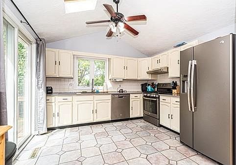 - Kit Dscrp: Window(s) - Picture, Ceiling Fan(s), Countertops - Stone/Granite/Solid, Deck - Exterior, Skylight, Flooring - Stone/Ceramic Tile, Stainless Steel Appliances, Slider