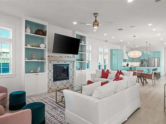 With 4 spacious bedrooms plus a bunk room and 4.5 beautifully appointed bathrooms, the home easily accommodates large families and guests. The bright, open-concept main living area features abundant natural light, high ceilings, and seamless flow between the living, dining, and kitchen spaces. Throughout the home, custom tilework and designer wallpaper add personality, warmth, and an elevated boutique–coastal feel.
