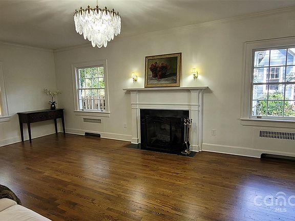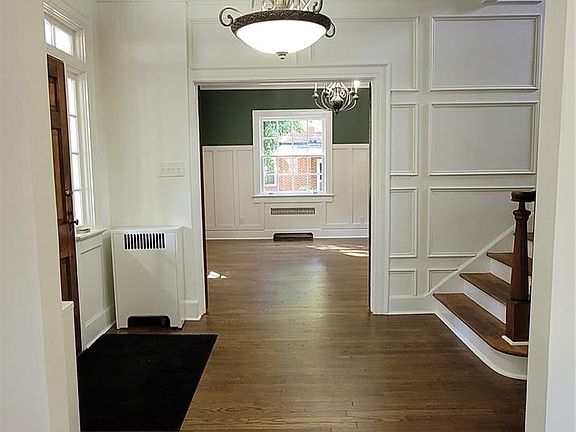 Step into the spacious foyer and be transported back in time. To your right, a generous living room welcomes you with gleaming hardwood floors and a cozy gas-log fireplace. On the left, elegant French doors lead into the formal dining room, featuring built-in corner cabinets and charming sconce lighting.