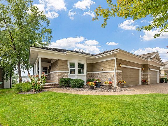 Wake up on the hill above downtown Wayzata with Lake Minnetonka framed right outside your windows. This is the sweet spot of Widsten Circle. Steps to coffee, restaurants, and the lake. Back home you get a warm, cedar-shake exterior, a covered front porch, and a floor plan that lives easy on two levels with big views and real privacy. Inside, light pours through bay windows across Saddle Black Walnut floors. The kitchen brings maple cabinetry fitted with roll-outs, workstation, full-height pantry, and a center island. The dining room connects cleanly to the living room where a gas fireplace with cultured stone and a reclaimed wood mantel anchors the space. Built-ins in rustic alder handle your media and display. A rounded bay takes in panoramic lake views and a full-glass door walks out to the screened porch and the wraparound balcony in the treetops. The primary suite sits quietly on the main level with vaulted ceilings, patio door to the porch, and a walk-in closet with custom organizers. The primary bath has room to exhale with a jetted tub on a tile deck, an oversized glass shower with bench, dual sinks, makeup counter, and linen storage. Main-level office with French doors and a bay window for focus. Main-level laundry with cabinets and sink. A proper half bath for guests. Downstairs, the lake views keep going. The family room is wide open for movie nights and game days with patio access to the lower terrace and shared green space. Bedroom two has water views and a walk-in. Bedroom three has French doors and a walk-in. There is a full bath, a flex room with a second kitchen for long-term guests or hobby time, and great storage. Outside, the lifestyle is ready to go. Maintenance-free wraparound balcony up top. Covered patio below. Beautiful mature trees, boulder walls, and a shared patio scene with a stone-wrapped wood-burning fireplace, pergolas, and garden beds. Finished and heated two-car garage with floor drain. Paver driveway. Cedar shake with brick accents for timeless curb appeal. This is the Wayzata walk-to-everything address that still feels like a retreat.