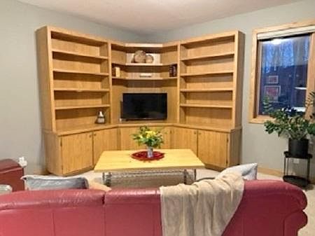 Large living space with built-in wood shelving unit, queen-sized leather sleeper sofa, large screen TV, pool table