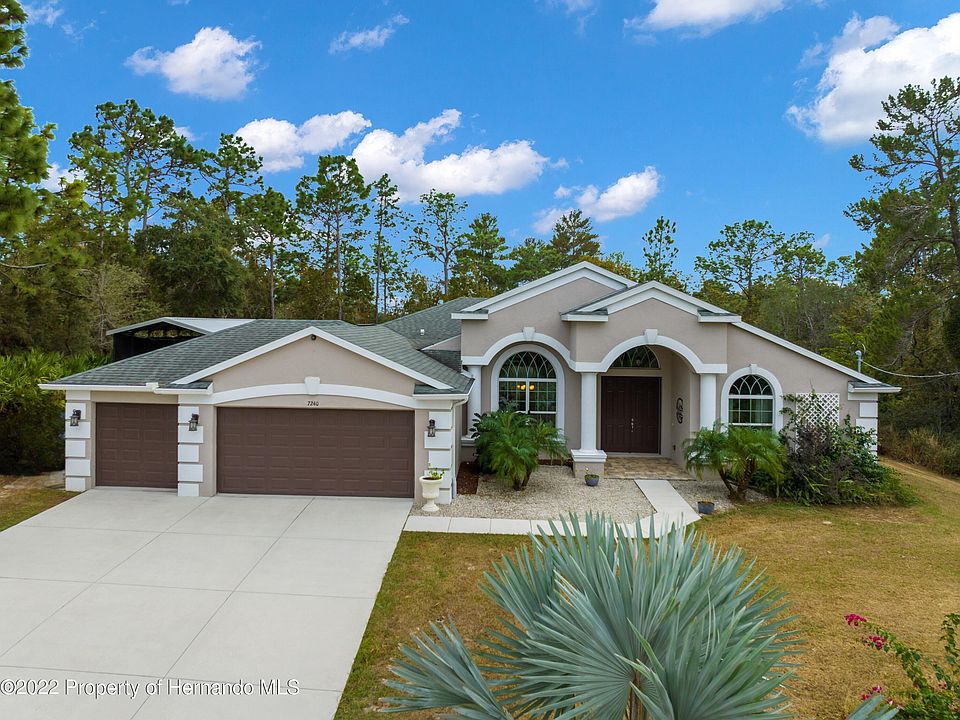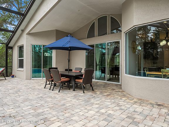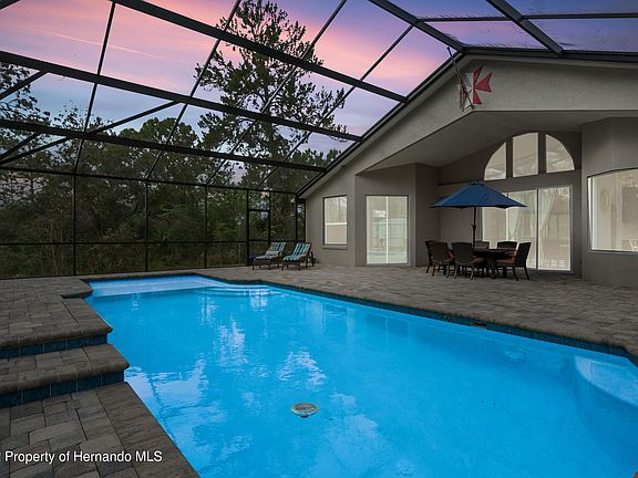 *ACTIVE UNDER CONTRACT* Accepting back up offers. This IMPRESSIVE Van Orden Model home situated on an ACRE lot in the Royal Highlands is only 5 years old! Luxury Designer windows allow tons of NATURAL LIGHT to showcase this GRAND three-bedroom, two-bathroom, three car garage, POOL home. Custom features include high tray ceilings, 8-foot doors and POCKET SLIDERS, Formal Dining room, Formal Living room, Great room with PLANTATION SHUTTERS, Breakfast NOOK with SEAMLESS WINDOW overlooking the pool area, The kitchen is a perfect hub of the center of the home which features a QUARTZ countertops, Wood Cabinets, Stainless Steel Appliances Breakfast Bar, Pantry closet, and Island with PREP SINK. The huge, covered LANAI is perfect for entertaining with pavers surrounding the SALTWATER POOL with SUN SHELF and WATERFALL feature. The OVERSIZED (19x15) Primary Suite features tray ceilings, sliders to pool, Luxury bathroom with large walk-in shower, glass door, tile and a bench seat, dual sinks and a huge (11x7) walk-in closet fit for a Queen! There is also a FLEX ROOM with GLASS FRENCH DOOR perfect for OFFICE/STUDY could be used for a 4TH bedroom. Large indoor laundry room leads to the Three Car Garage which has an exterior door leading to the back where you will find a 30-foot covered awning perfect for RV/BOAT and a Finished WORKSHOP/SHED (27x15) with AC and Electric. Close to Weeki Wachee Springs and Gulf of Mexico for tons of WATER ACTIVITIES and Entertainment. MUST SEE!!