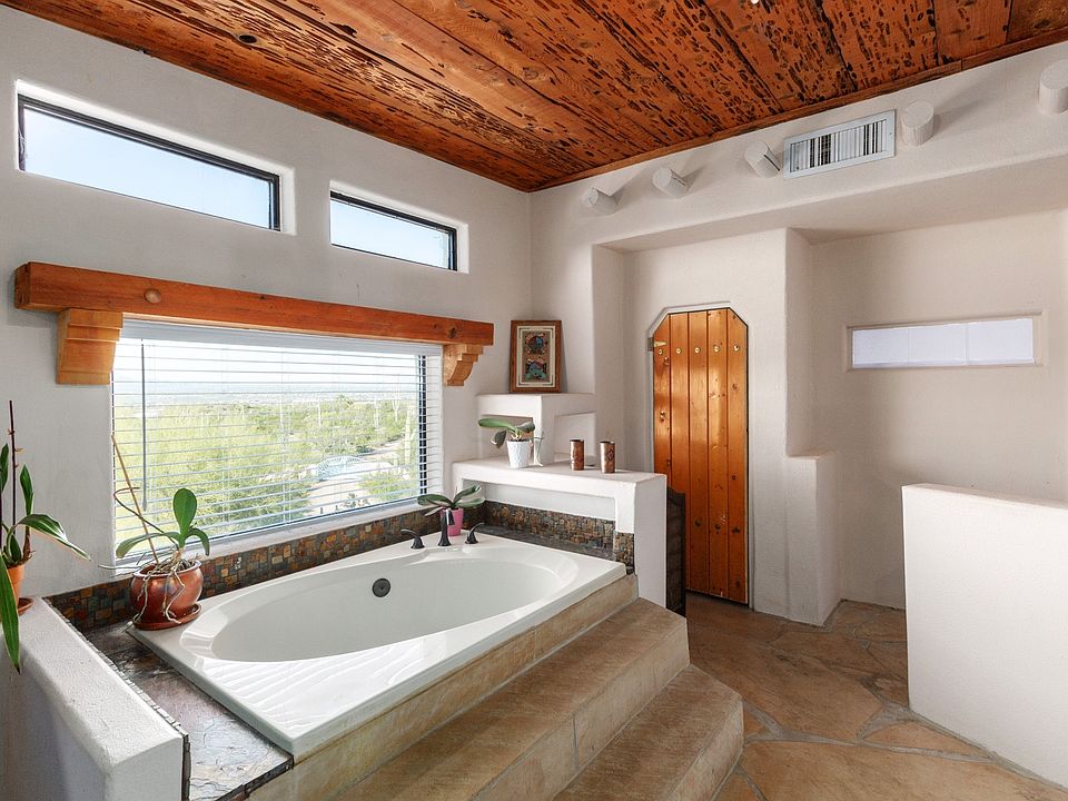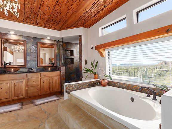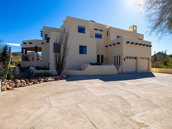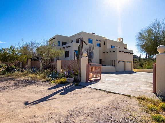 Absolutely stunning Santa Fe style home available on 3.49 acres of property in west Tucson. Breathtaking city lights and mountain views. Two story, 3 bedrooms and 2.5 bathrooms with exquisite finishes throughout. Exposed viga beam ceilings and pillars. Flagstone and Wood Floors. Artisian doors. Gorgeous kitchen with rustic hickory cabinetry, a built in wine rack, ss appliances and a custom island with breakfast bar. Walls of windows and multiple patios presenting beautiful panoramic views. Master retreat with incredible spa inspired en-suite. Backyard oasis is is a dream come true featuring a sparkling pool with rock water-slide feature, a spa and a covered patio with unobstructed desert views of majestic saguaros and mountain tops.