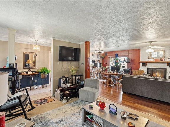 Inside offers a well-designed floor plan with generously sized bedrooms, a cozy wood-burning fireplace, a built-in aquarium, and a flexible dining area currently used as a bonus room. Pella sliding doors from both the living room and primary bedroom open to the backyard, creating great natural light and easy access to the outdoor spaces.