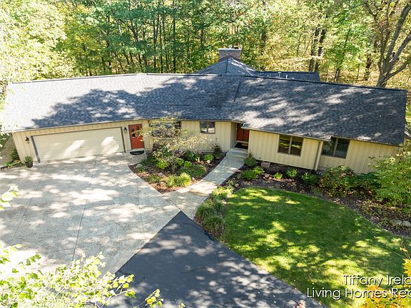 Nestled on a wooded hilltop with easy access to the adjacent White Pine Trail, this beautifully updated walkout ranch offers over an acre of scenic privacy and comfort—perfect for nature lovers and active lifestyles alike! Step through the front entry into a spacious sunken great room, highlighted by a stunning brick gas fireplace, beamed vaulted ceilings, lots of windows to take in the beautiful nature, plus French doors leading into a serene 4 season sunroom finished with whitewashed knotty pine. The remodeled kitchen features modern appliances, quartz topped center island, and a fresh, functional layout ideal for cooking and entertaining. The main level includes 3 bedrooms, 2.5 bathrooms - a large primary suite with a private bath, plus mainfloor laundry. Downstairs, the walkout level expands your living space with a huge family room, a wood fireplace, a fourth bedroom (with unfinished closet), a versatile exercise, crafting or playroom, a sauna with private shower and a large workshop/storage area, perfect for hobbies or projects. Generac generator, invisible fencing, hot tub, 2020 water heater, 2024 roof, security system, 21x28 outbuilding - plenty of storage for the fun things in life! This home is a unique blend of peaceful retreat and everyday functionality - don't miss your chance to see it!