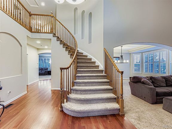 Welcome to this stunning two-story home, perfectly situated on a spacious corner lot in the highly desirable Sapphire Pointe community. From the moment you arrive, you'll be charmed by the beautifully landscaped front yard and welcoming covered porch. Inside, the home offers a bright and airy feel with high ceilings, fresh paint, and tasteful updates throughout. The main level features elegant formal living and dining rooms, along with a gourmet kitchen equipped with brand-new stainless steel appliances, granite countertops, a center island, and a cozy breakfast nook that looks out onto the backyard. The adjoining family room invites you to relax by the gas fireplace, framed by plantation shutters for added style and comfort. A private office with French doors makes working from home easy, while a convenient half bath and laundry room—complete with sink, washer, and dryer—add everyday functionality. Upstairs, you’ll find four spacious bedrooms, including a serene primary suite that serves as a true retreat. Enjoy your own sitting area, a second gas fireplace, and a spa-inspired ensuite with a soaking tub, dual vanities, and a walk-in closet. The finished basement offers even more living space, featuring a large rec room, wet bar, home theater, an additional bedroom and full bath, plus generous storage. Step outside to your private, oversized backyard—perfect for entertaining or relaxing—with a large patio and built-in spa. As part of the Sapphire Pointe community, you'll have access to wonderful amenities including a pool, clubhouse, parks, scenic trails, and fun events all year long. All just minutes from Castle Rock’s charming historic downtown and popular outlet shopping.