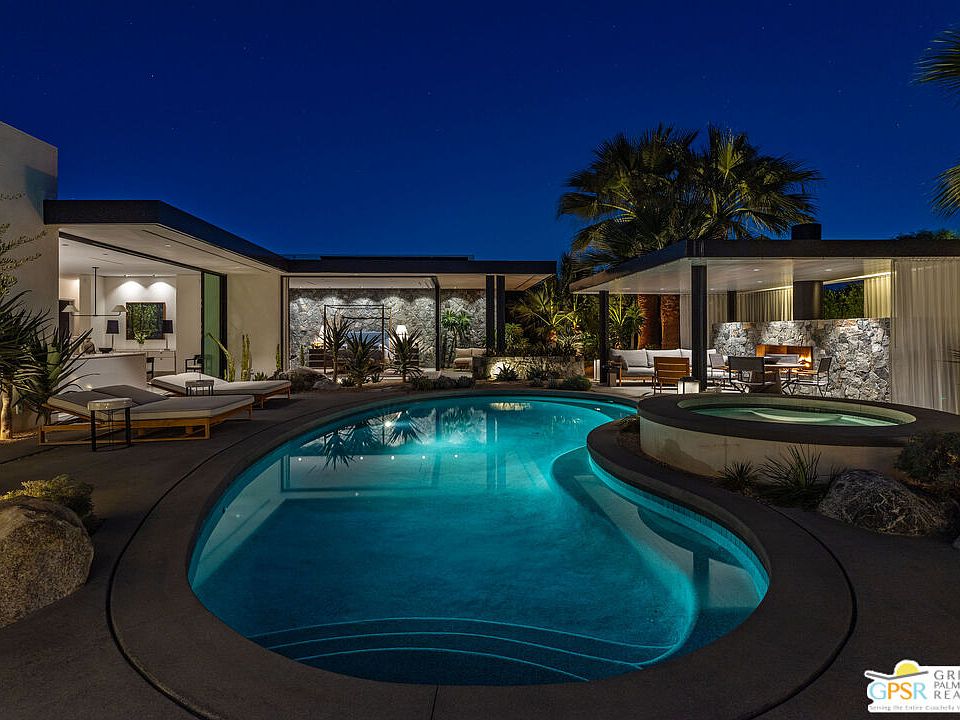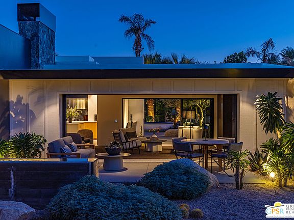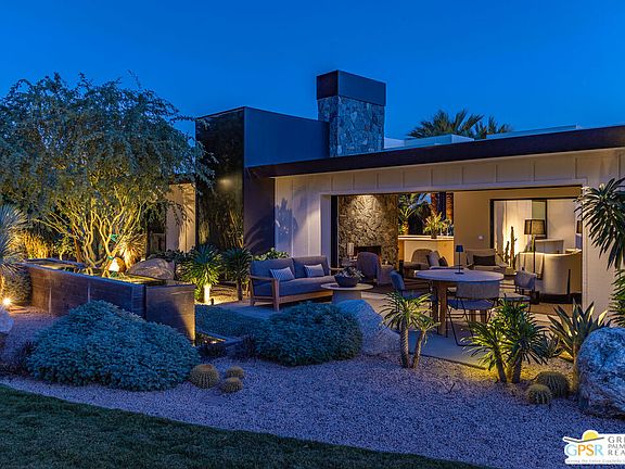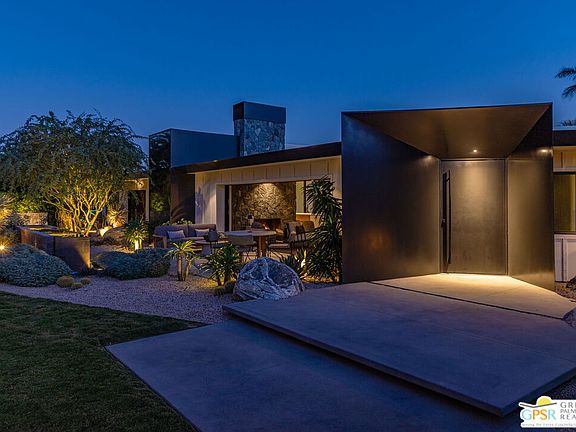Renowned architect Sean Lockyer of Studio AR&D combined forces with interior designer Anthony Cochran to redefine a rare 1940s homestead in Rancho Mirage and double the footprint with a new addition. Historic preservation meets stunning contemporary architecture in this down-to-the-studs remodel where no expense was spared. Four bedrooms plus media room offer flexible spaces, with one set up as a poolside office, the other as a home gym. Fleetwood sliders in the living room and a dramatic disappearing corner of the primary bedroom open to mountain views and a lushly landscaped pool courtyard with architectural shade pavilion that invites fireside lounging and dining. Where the architect brought his signature hand-built stone masonry, crisp linear minimalism and bold statements made in blackened steel, the designer imparted a gentler contrast of European influences, classic textures and a neutral palette infused with soft blue-grey. Bathed in natural light, the open dining and kitchen area features Wolf and Sub-Zero integrated appliances, quartz countertops and a concealed wet bar. Myriad outdoor gathering areas around firepits join a citrus orchard, sculptural cacti, a cook's garden and a collection of ancient olive trees to form a mature natural paradise on all sides, perfect for seasonless enjoyment. Endless details include Lutron programmable lighting, car charging station and custom craftsman fabrication for heritage quality. Two worlds blend flawlessly in a timeless specimen that juxtaposes the past and present of true desert living.