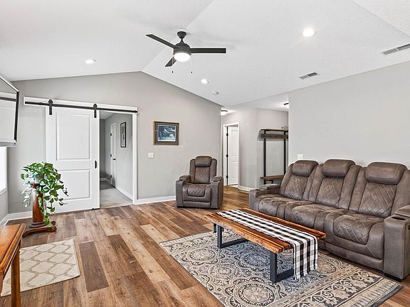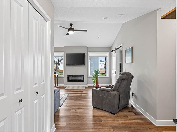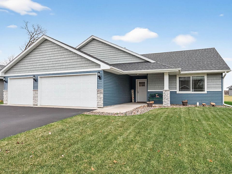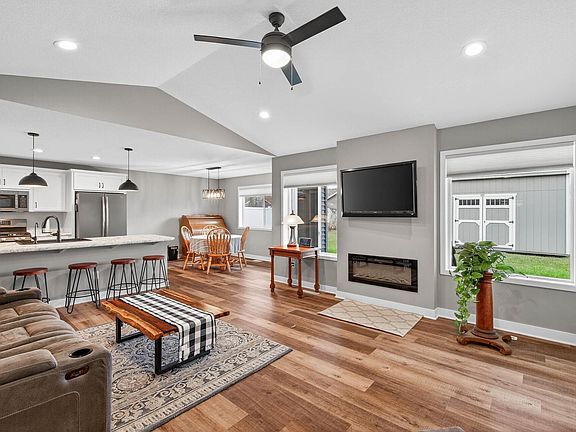 Beautiful one level living in newer development just minutes from the cities. This home boasts with an open living concept for all your entertaining needs. The custom kitchen has upgraded appliances and plenty of cabinets for ample storage. While the living room has vaulted ceilings you get the cozy feeling with the electric fireplace. The bedrooms are spacious with an open inviting feel. The primary has on ensuite walk in bathroom with a walk in closet. Outside you will find the yard has been nicely landscaped with rock and edging and also has inground sprinkler system, allowing you to enjoy all its beauty with minimal upkeep. There is a nice size shed in the back yard to store all of your yard/gardening stuff.