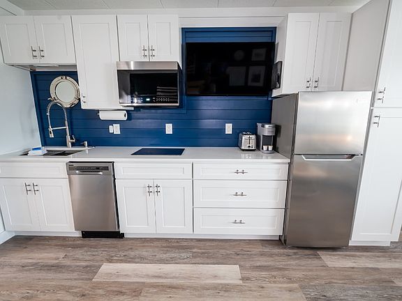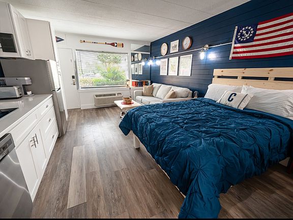 Walk or ride your bike to the beach! Beautiful, studio style condo across the street from the Intracoastal Waterway and 1 mile to Wrightsville Beach. Fully renovated space of 312 square feet. Kitchenette with soft close cabinetry and solid surface countertops. Kitchenette is equipped with an ample sized fridge/freezer combo, dishwasher, two burner induction cooktop and microwave. Kitchen is outfitted with all necessary cookware, dishes, cups and utensils. Stacked washer and dryer. Custom tile shower with shower head and separate handheld spray. Epoxy floors for easy maintenance. Monthly rent includes cable TV, wireless internet, water and electricity up to $75 per month. Home is available November 1st 2025 to May 1st 2026.