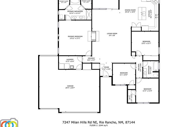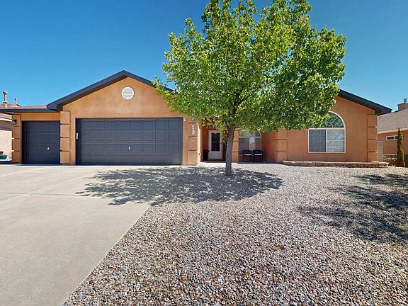 Beautiful, single-story 4 BR, 2 bath, 3 car- garage home, w/ backyard access conveniently located in North Rio Rancho/Enchanted Hills area. Desirable split floorplan with spacious primary suite, bath with garden tub, separate shower, double sinks, and two walk-in closets. Living/dining/kitchen flow together to create a large great room for entertaining. Cook's kitchen w/ island, breakfast bar, 2 sinks and tons of storage. Luxury vinyl flooring and tile throughout - no carpet. Garage w/ pull-through access to backyard. Furnace/AC new in 2024. Plumbed for water softener. Tankless HW Heater in 2022. Mountain views from the low-maintenance backyard with covered patio & storage shed. Drip irrigation in front and back on timer. A really special property with so much to offer for the price!