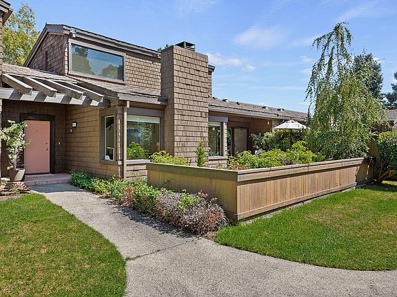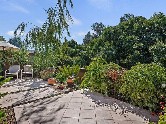 Set on nearly 20 acres with greenbelts and views of a community avocado and lemon orchard, this property offers exceptional privacy at the rear of the development. The home features two spacious tile patios, one at the front entrance and another off the kitchen for sunny gatherings. Inside, cathedral ceilings with a wood beam and large windows fill the living room with light, anchored by a wood-burning fireplace. The open dining area has high ceilings, an artistic chandelier, and patio access. The kitchen includes stainless-steel appliances, a built-in desk + breakfast nook. The first-floor primary bedroom features an ensuite bath, sliding doors to the back patio, and custom vintage Brazil Rosewood wall to wall shelving. Upstairs has two bedrooms, a shared bath, and extra storage. Two covered carport spaces and plenty of guest parking. Community amenities include a pool, clubhouse, tennis courts, and orchard access. HOA covers common area maintenance, common insurance, landscaping, limited RV parking, roof + exterior maintenance, & more. Lovingly maintained by its original owners for over 40 years, this home blends character, comfort, and care throughout.