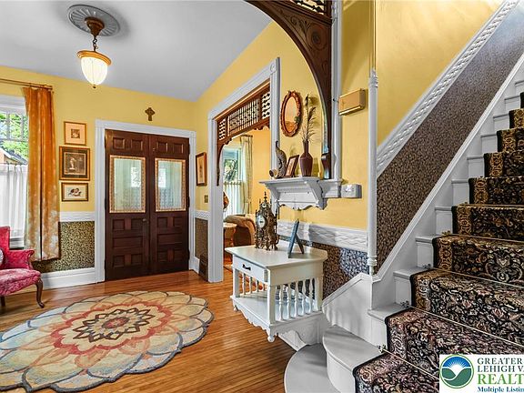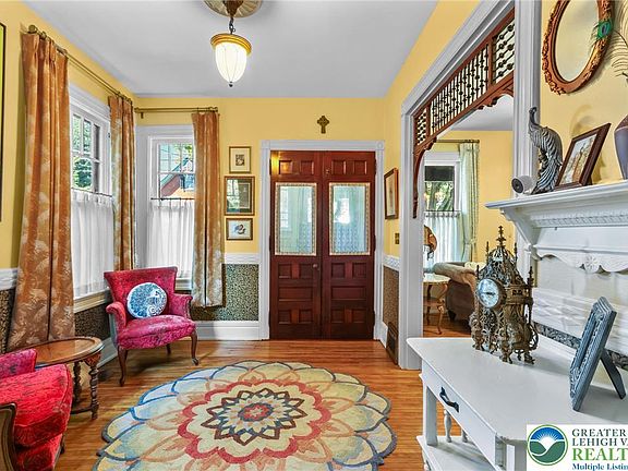 Enter through the gracious double door foyer and be welcomed by period fretwork, carved chair rail and leaded glass windows. The formal living room with custom window treatments offers an ornamental fireplace, built in bookcase w/ carved doors and Victorian fretwork. The formal dining room displays more ornate fretwork, an ornamental fireplace, decorative box bay and unique Butler’s pantry with built in cabinetry, plate rail and wainscoting. The gourmet kitchen can be the basis of wonderful dinners: a center island with seating, granite countertops, glass tile backsplash and updated stainless steel appliances. Pass through the French doors to the cozy 4 season Sunroom with a free-standing pellet stove surrounded by multiple transom windows. From here, enjoy views of the enchanting backyard — a private retreat with perennial gardens, lush greenery, and a tranquil fountain. A full bath with a lovely soaking tub, new fixtures and beaded board ceiling complete the first floor. The second floor offers 3 bedrooms, multi-purpose room and a full bath. The third floor has 2 more bedrooms and an extra room for office, play area or exercise spot. Garage/Carriage house is complimented by a 2-car parking pad in a private alley – a rare find on College Hill. Located steps from Lafayette College and walkable to neighborhood shops, dining, and parks.