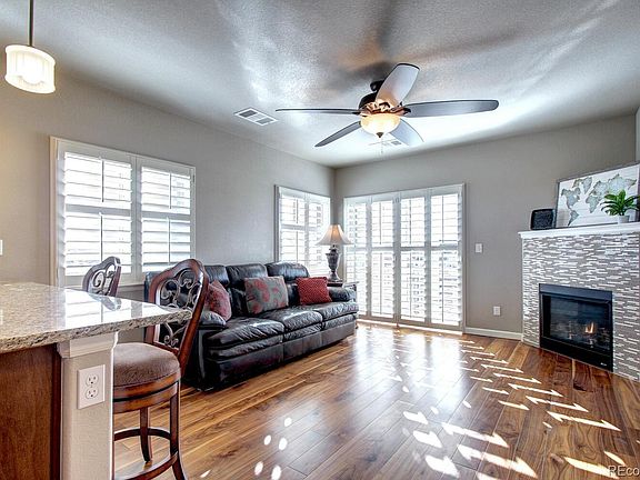 RARE - Top Floor, Corner Unit Location with Wrap Around Patio/Balcony Featuring Mountain and City Views! 2 Bedroom, 2 Bathroom, 1,030 SF Condominium located within the Clocktower at Highlands Ranch Town Center! Bright interior, stunning views and a spacious casual open concept floor plan provide the backdrop for this home's comfort and livability. Secured building access plus underground parking with heated driveway, this unit includes a 1-car reserved parking space and secured storage (#27). Inviting Foyer/Entry welcomes you into this spacious home boasting wide plank flooring, plantation shutters plus Laundry with stackable washer/dryer included! The Living Room showcases a cozy gas fireplace with mosaic tile surround, an abundance of natural light and access to the outdoor wrap around patio/balcony with unobstructed mountain and city views. The chef's Kitchen showcases all appliances, granite counters, tile backsplash, breakfast bar and Dining area perfect for enjoying your morning coffee! The Secondary Bedroom provides the flexibility for roommate or private study/home office workspace with an adjacent Full Bathroom featuring a new tub and tile shower surround. The Primary Bedroom features an en-suite 3/4 Bathroom and walk-in closet outfitted with custom closet system. Conveniently located steps from Highlands Ranch Town Center shopping, dining, retail, RTD, Civic Green Park, Library and miles of walking/biking trails! This vibrant community provides 4 state of the art recreational centers featuring fitness, pools, tennis, community events and more! Don’t miss the opportunity to create your new home within the Clocktower at Highlands Ranch community!