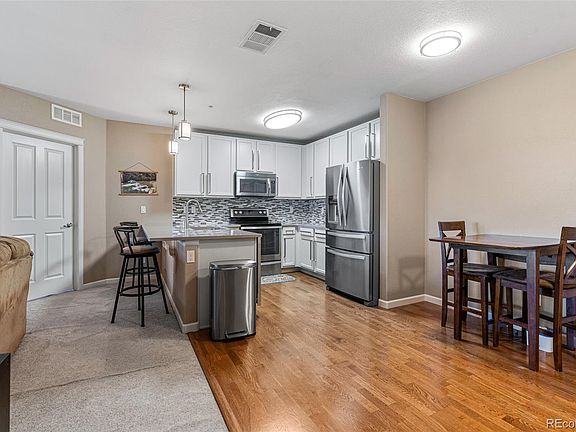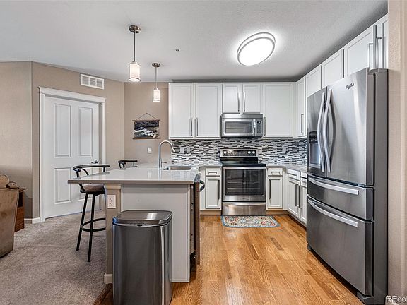 This is such an awesome unit that is move-in ready! This condo at the Clocktower at Highlands Ranch Town Center, is located in such a convenient location. The 2 bedroom, 2 bathroom, very spacious open concept floor plan has each bedroom on the opposite side of the main areas, for more privacy. There is secure building access plus an underground parking space with a heated driveway! This unit includes a 1-car reserved parking space plus secured storage. Take the elevator right up to this third-floor home boasting updated flooring including IN UNIT laundry with a stackable washer and dryer. The light and bright living room has a large sliding glass door that opens to the private balcony, perfect for morning coffee with the sunrising or meals on warm days that CO has to offer. The living room also has a cozy gas fireplace and a modern ceiling fan. The kitchen offers stainless appliances, modern lighting, and quartz countertops with a breakfast bar and dining area. The primary bedroom has a large closet and en-suite¾ Bathroom featuring a single vanity with quartz counters and linen closet for storage. Location is key, with this units quick and easy access to CO470, Santa Fe Drive, minutes to I-25 and a .3 mile walk to the RTD Park and Ride Town Center station taking you anywhere you want to go, including the Mineral lightrail Station. Conveniently located steps from Highlands Ranch Town Center shopping, dining, retail, brewery to enjoy a craft beer, Civic Green Park featuring concerts and events, miles of walking/biking trails, Library, Target, grocery and PetSmart just around the corner means your friend(s) can come too! This vibrant community provides 4 state of the art recreational centers featuring fitness, pools, tennis, community events and more! There is access to many trails in the Daniel's Park area, including Wildcat Mountain. Don't miss the opportunity to create your new home within the Clocktower community, on one of the rare 3rd floor units available!