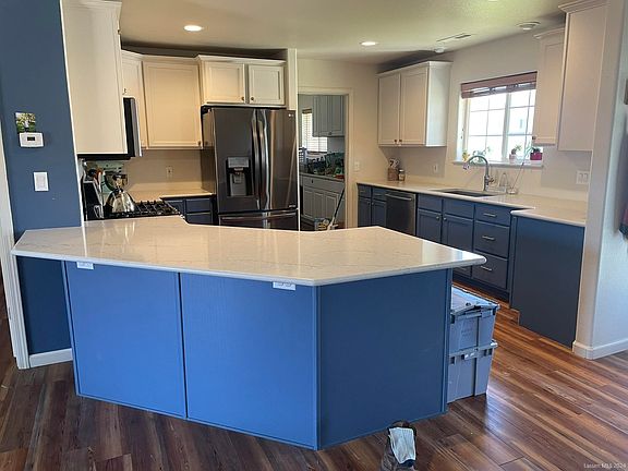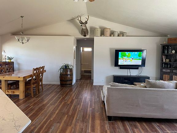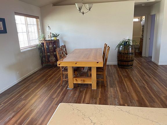 This 3 bedroom 2 bath is newly remodeled and is in a perfect location for a family. It's located within walking distance of the local elementary school and local restaurants. In 2021 the flooring was replaced, fresh interior paint, new kitchen appliances, counters and painted cabinets. Quartzite counter tops are easy to clean and scratch and heat resistant. There are pull out drawers in lower cabinets in the kitchen with lazy Susan's in the corner cabinet. It has a very spacious master bedroom with a master bathroom having dual sinks. Beautiful vaulted ceilings in the living room with built in display shelving. The vinyl flooring has a tiny hint of blue that goes perfectly with the blue cabinets. It has central heating and air to keep you comfortable all year and is wired and set up for a stand by generator. There is a laundry room with counter tops to fold clothes and it has a nice open floor plan. With automatic sprinklers in front and back yards, maintenance is low, the back yard is fully fenced with a large concrete patio. It has an attached 2 car garage with over head storage. Being a coner lot allows for lots of street parking but you may not need it often with the 5 car driveway allowing got RV parking. There are large double swing gates giving large access to the back yard. The back yard has a beautiful mountain view.