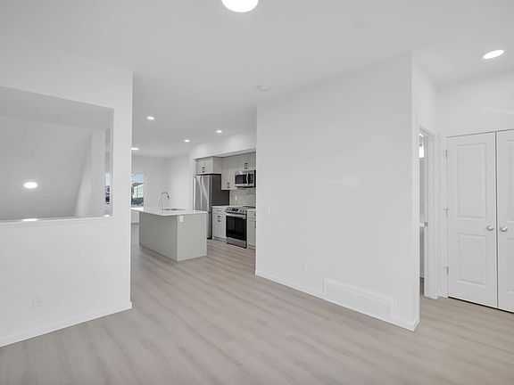 Main living floorLarge kitchenLiving and dining spacesSpacious kitchenQuartz counter-topsLight grey cabinetsStainless steel appliances