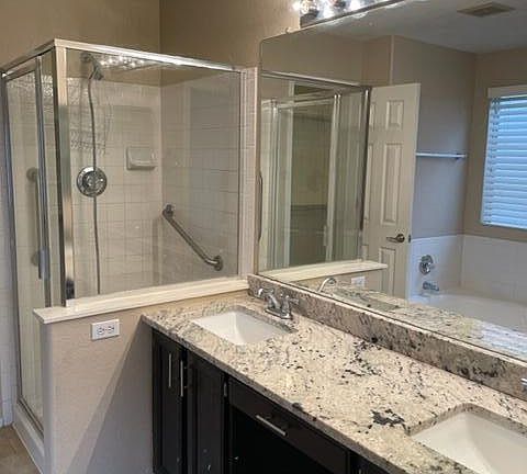 Extended covered patioLow maintenance landscapingWalk in closetGranite countertopsLarge master bedroomArtificial turf areaDual vanities