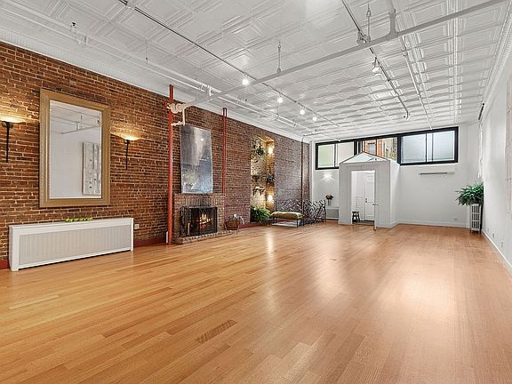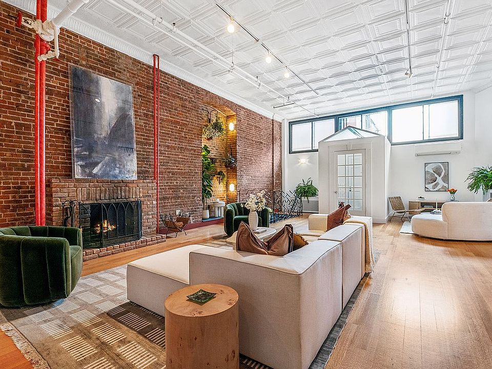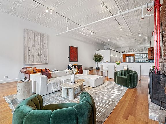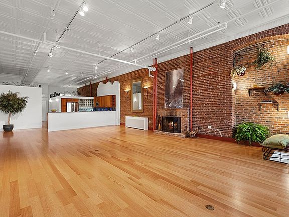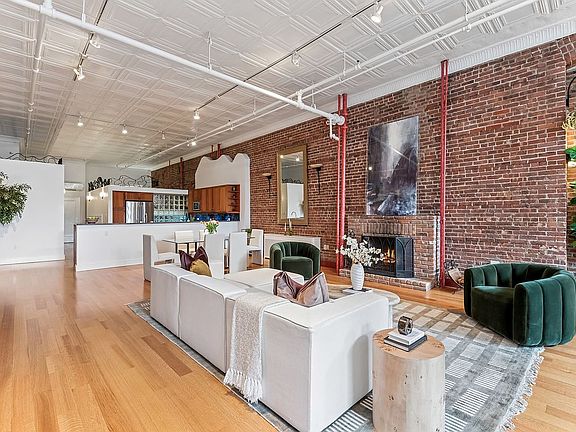 Upon entering the loft, the grand scale and architectural artistry of the great room immediately impress. Exquisite red oak hardwood floors, exposed brick walls, tin ceilings, a wood-burning fireplace, and bespoke ironwork create a space that is both dramatic and inviting. The large chef's kitchen has rich cherry wood cabinetry, handcrafted tile-work, a convection oven and dishwasher. The bathroom is stunning. It's a spa-inspired space with marble & stone tiling, an open rainfall shower and a clawfoot soaking tub. A staircase, framed by built-in bookshelves, leads to the sleeping loft, a lovely room perched above the great room and bathed in soft light. There is also a dedicated laundry room, a large walk-in closet, and 3 additional storage closets.