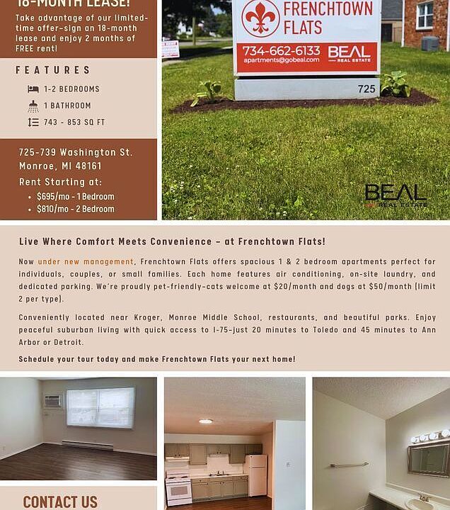 2 Months Free with 18-Month Lease! Take advantage of our limited-time offersign an 18-month lease and enjoy 2 months of FREE rent! Experience the perfect blend of comfort and convenience at Frenchtown Flats, offering 1-bedroom and 2-bedroom units ideal for individuals, couples, or small families. Each apartment features air conditioning, on-site laundry facilities, and dedicated parking. We're a pet-friendly community, welcoming cats for $20/month each and dogs for $50/month each (maximum of 2 per pet type). Located in Downtown Monroe near Monroe Middle School, Frenchtown Flats combines small-town charm with city accessjust 20 minutes from Toledo and 45 minutes from both Ann Arbor and Detroit. Enjoy walking-distance access to Kroger, local restaurants, Lake Monroe, and all the charm of downtown. Schedule your tour today and make Frenchtown Flats your new home!