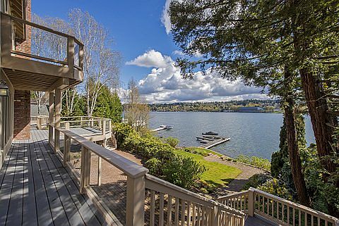 Stunning traditional home sits gently on 1/2 acre of lush landscaping including 105 ft of waterfront and private dock. Gated entry, three levels of living space, 6 BD, 5.5 BA, remodeled kitchen w/ gleaming white cabinets, slab granite and stainless appliances,5 fireplaces,3 car garage, across the lake from Seahawks training center, gracious floor plan provides formal and informal spaces, master suite w/luxurious bath, glorious views and adjacent sitting room w/fireplace. Move in condition!