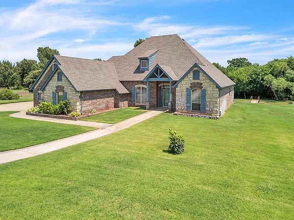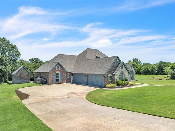 Welcome to this stunning 4-bedroom, 3.5-bathroom home, perfectly situated on 2.43 picturesque acres in the gated community of Cedar Lake Estates. This beautifully designed property features a classic combination of brick and stone exterior, recently refreshed with new exterior paint, giving the home timeless curb appeal. Step inside to discover a thoughtfully crafted interior, where vaulted ceilings in the living room create an open and airy atmosphere. The home offers a mix of wood floors, tile, and carpet, blending warmth and durability throughout the space. For those who work from home or need extra space, the dedicated study is a standout feature — complete with tons of built-in shelving, making it perfect for a home office, library, or creative space. The 4-car garage ensures you have plenty of room for vehicles, hobbies, and storage. The outdoor space is just as impressive, offering a covered porch, a peaceful sitting area with a pergola, a charming hand-built bridge, and a small outbuilding that’s perfect for additional storage or a workshop. Located within the highly acclaimed Edmond Public Schools district, this property offers the ideal combination of privacy, space, and convenience, with easy access to shopping, dining, and major highways. This home is a rare find — schedule your private tour today and experience everything it has to offer!