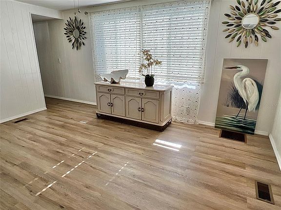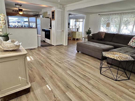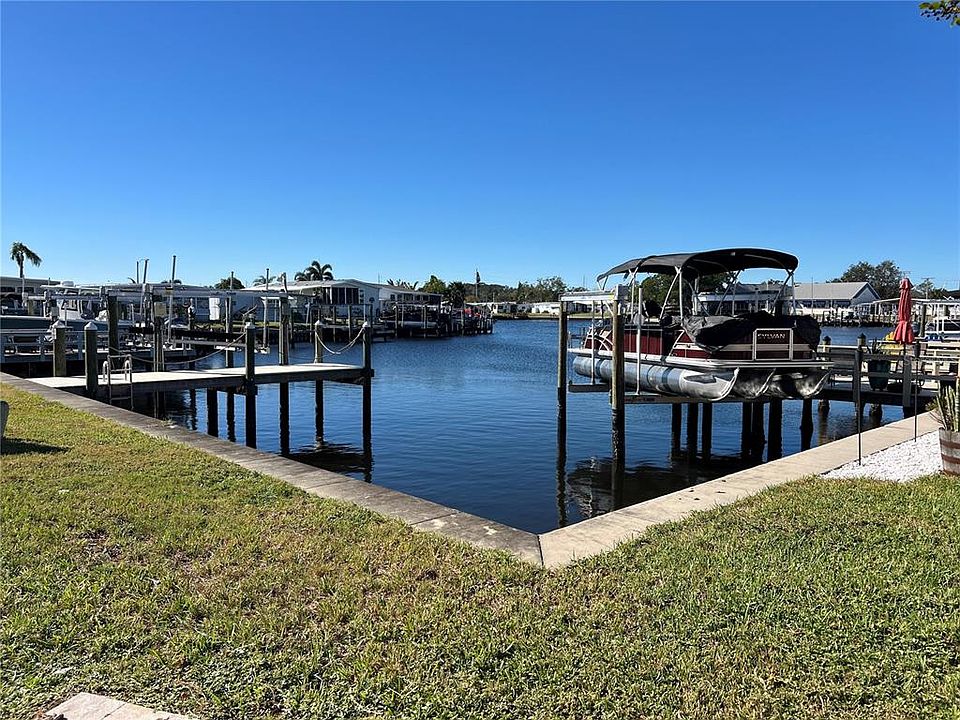 Ready for fun! Affordable waterfront! No flooding! Move-in ready! This 2 bed/1.5 bath waterfront home would make a great winter escape, full time residence or investment property as renting is allowed with 2 month minimum. With 40 feet of waterfront and a back patio to enjoy the views, the home features wood-look laminate flooring throughout, screened side lanai to enjoy the sunshine, 2024 vapor barrier to protect the subflooring, 2024 A/C system and ductwork, 2017 roofover, 2023 paver patio/sidewalk to back, large shed with dryer hookup; washer hookup is inside. Comes furnished with seaside motif! Build a dock or lift! Price includes share for the lot and ownership in the Co-op. Concrete seawall is maintained by the Co-op--a great benefit! Beautiful location on saltwater open canal to Tampa Bay with no bridges. Home is in premier Americana Cove with lots of amenities including heated pool, fitness center, clubhouse, billiards, two private boat ramps and kayak launch and so much more. Low monthly maintenance fee is $380 and includes water, sewer, trash pick up, lawn maintenance, 24 hr manned gate, seawall maintenance, private streets and all amenities. Wonderful location only 10 mins to downtown St Petersburg, minutes to 4th Street shopping and 25 mins to beaches. Two dogs or cats up to 35 pounds are welcomed; 2 pets total each household. This is the the cozy water retreat you've been dreaming about!