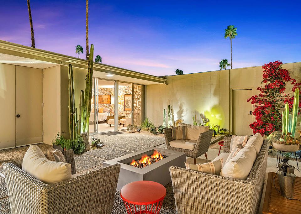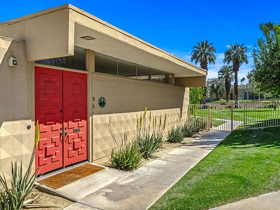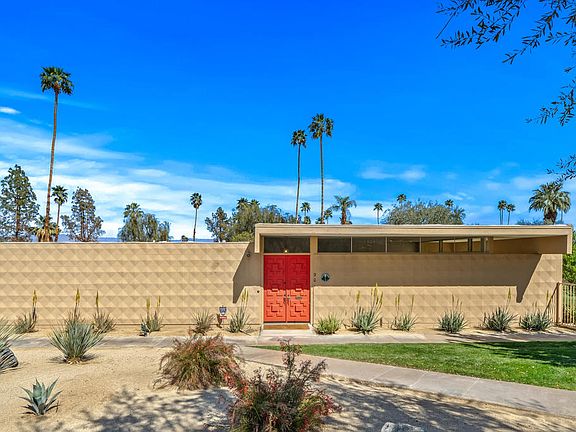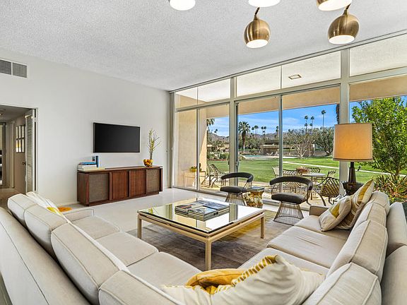 Sandpiper Mid-Century jewel - Designed by William Krisel. Step into a meticulously preserved mid-century modern masterpiece in the heart of Palm Desert's iconic Sandpiper community. Designed by the legendary William Krisel and built in 1964, this three-bedroom, two-bath condominium (approx. 2,077 sq. ft.) stands as a pristine example of Desert Modernism at its finest--its original design thoughtfully maintained and celebrated. From the moment you enter, you're immersed in classic Krisel architecture: exposed concrete block walls, high ceilings, clerestory windows, light pouring into every room and an effortless indoor-outdoor flow. There is beautiful porcelain tile flooring throughout living areas and baths with carpeting in the bedrooms. The kitchen features original wood-finished cabinetry married with quartz countertops with waterfall edges and gorgeous backsplash tile honoring the vintage feel. The bedrooms retain their original closet doors, while the bathrooms showcase authentic countertops, cabinetry with original pulls, and classic shower enclosures. This residence is a true time capsule, offering a glimpse into the elegance of mid-century living. Beyond the interiors, the private patio is an architectural treasure with original exposed pebble-finish concrete and desert-landscaping, a seating area with fire pit, and a dedicated outdoor laundry room. From the poolside patio, breathtaking southeastern mountain views complete the picture with a resort like pool area beautifully landscaped. This unit's historic significance is undeniable: it is prominently featured in the definitive William Krisel's Palm Springs (The Language of Modernism) book. Furthermore, it holds a historical designation and benefits from the Mills Act program, ensuring both its preservation and potential property tax benefits for its next owner. Mid-century purists and enthusiasts - opportunities like this are exceedingly rare.