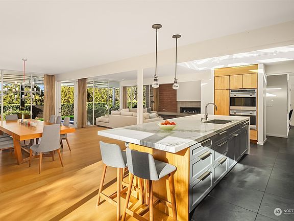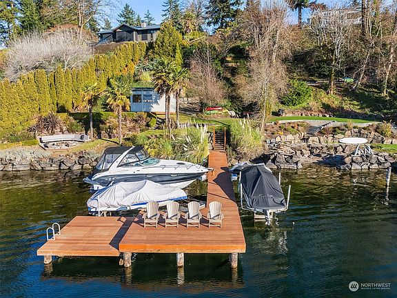 Mid-Century Modern w/ Westside Shared Water & Boat Moorage! Rare, turnkey rambler on oversized, flat lot in sought-after West Ridge neighborhood. Beautifully renovated, sophisticated updates stay true to mid-century esthetic. Peaceful & Zen-like. Clean lines & exquisite finishes: handmade tiles, wide plank hardwoods, skylights & designer lighting. Stunning sunsets, lake & mtn views from floor to ceiling windows. Ideal floorplan w/ center stage kitchen, open dining & living spaces. Primary suite w/ walk-in closet & 5 pc bath. 2 more BDRs + breezeway to separate guest studio. Seamless indoor/outdoor living: covered patio w/ custom pergola, outdoor heaters & fire table for year-round enjoyment. Community waterfront w/ dock & boat lift!