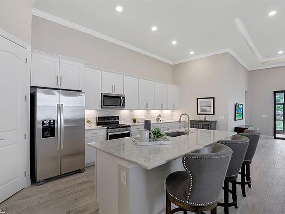 AVAILABLE JANUARY, FEBRUARY, MARCH, APRIL 2026. Owner will lease 2-3 or 4 months... BOOK NOW for season & receive a discount!! JUST LISTED--Perfectly situated on a premium lot on the highly favored Western side of the street with sparkling LAKE views, this bright 1-story Orleans model will WOW you, boasting easy-care WOOD PLANK TILE in coastal tones THROUGHOUT the home & IMMACULATE! Impact glass windows/doors are a huge upgrade, providing effortless peace of mind. You'll love the neutral upscale finishes and over $140,000 in upgrades: welcoming quartz island/counters, glass tile backsplash, stainless appliances including GAS stove and water heater, walk-in pantry, and elegant white shaker cabinets with pull-outs and under-cabinet lighting in the open kitchen. Oversize lanai and garage. Both baths feature upgraded shower tile to the ceilings with glass tile insets, and granite counters with contemporary sinks. 12 ft. tray ceilings add to the open feel. Locals know gated Avery Square as one of Naples' newest neighborhoods within 3-4 miles to beaches, sidewalks to shopping, gourmet dining, RITZ-Carlton resort and night life at Mercato and Waterside Shoppes! One garage space included!