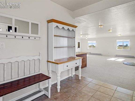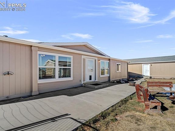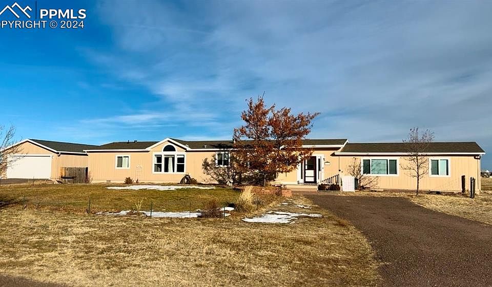Wonderful home, over 5 acres close to town! Updated kitchen with new counters and flooring. Very clean! The detached garage is over 800 square feet, a 4 car tandem with room for workshop. In addition to the spacious living room with vaulted ceilings, there is a 29x23 flex space which could be updated to a in-law suite or left as an oversized family room with so many possibilities! Master bedroom has an ensuite bathroom with garden tub. There are 2 additional bedrooms with a full hallway bath. Partially landscaped backyard has fenced area for dogs as well as a shed and chicken coop. Amazing views of Pikes Peak from living room, kitchen, family room and the lot. Property Owner Association includes water from community well and trash pickup. Septic just serviced, multiple new windows installed, fresh paint in and out! Close to award winning District 49 schools. Come see your home on the range, so private yet just minutes away from restaurants, grocery stores and shopping!