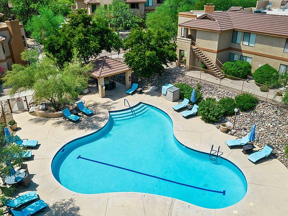 Charming ground floor condo overlooking desert landscaping & the neighborhood pool area in the resort style community of Villas At Sabino Canyon. This spacious Northern Tucson property is conveniently located near shopping, numerous restaurants & Sabino Canyon Park and features an open split bedroom floor plan, 4 recently installed ceiling fans, private primary suite with walk-in closet, covered North facing patio with storage closet, newer carpeting, Whirlpool washer / dryer included, remodeled primary bathroom shower and Catalina Foothills schools. The Villas At Sabino Canyon have a gated entryway, heated pool & spa, exercise facility, bbq grills and well maintained grounds.