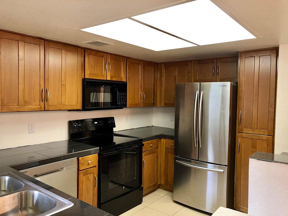 Remodeled spacious open kitchenStone counter topsJacuzzi bathtubTile floorCeiling fansStainless steel appliancesBeautiful wood cabinets
