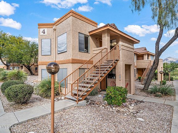 Experience elevated Foothills living in this 3-bedroom, 2-bath residence within the gated Villas at Sabino Canyon community. This desirable upstairs corner unit offers a bright and open great room concept, enhanced by abundant natural light and serene Catalina Mountain surroundings.Interior features include stylish pleated window shades, thoughtfully placed ceiling fans, and a blend of tile and laminate flooring throughout. The kitchen is equipped with a sleek stainless steel refrigerator and offers a functional layout ideal for everyday living or seasonal enjoyment.Residents of this resort-style community enjoy access to exceptional amenities, including a sparkling pool and spa, well-appointed fitness center, and meticulously maintained common areas.