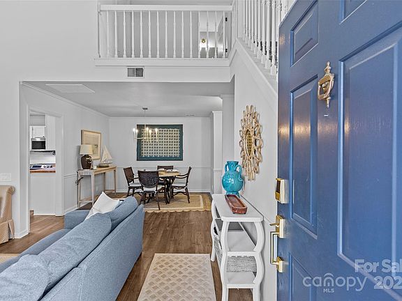 A rare opportunity in The Gates at Quail Hollow. This three-bedroom floor plan with two car garage includes a main-level primary suite and extensive interior updates. Newer flooring on the main level, popcorn ceilings removed plus a must-see full primary bathroom renovation! Two-story great room features a painted fireplace, built-in shelving, and a wall of windows with French doors leading to one of two private patios. Kitchen includes brand-new butcher block counters, new tile backsplash, ample cabinetry, breakfast area, and direct access to spacious 2 car garage with plenty of storage. Adjacent dining room offers a wet bar area and updated lighting. The primary bedroom has two closets and a fully updated en-suite bath with stylish custom finishes and oversized shower. Two additional bedrooms upstairs share a full hallway bath. Set in a prime South Charlotte location with quick access via Park Road, this quaint, tree-lined community is a rare fine! Community amenities include a newly updated clubhouse, fitness center, outdoor pool, green space and walking paths perfect for dog-lovers! Minutes to Quail Corners, SouthPark, Park Road Shopping Center and McMullen Creek Greenway.