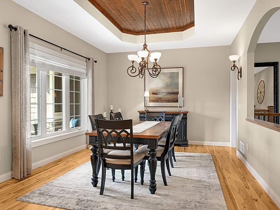 elegance. The first-floor office features beautiful custom built-in cabinets and French doors, while the spacious formal dining room with its wooden inlaid custom tray ceiling is ideal for entertaining. The great room showcases a cozy fireplace framed by custom knotty alder built-ins and ceiling beams, and the amazing kitchen boasts warm knotty alder cabinetry, granite countertops, a large center island, built-in double ovens and a walk-in