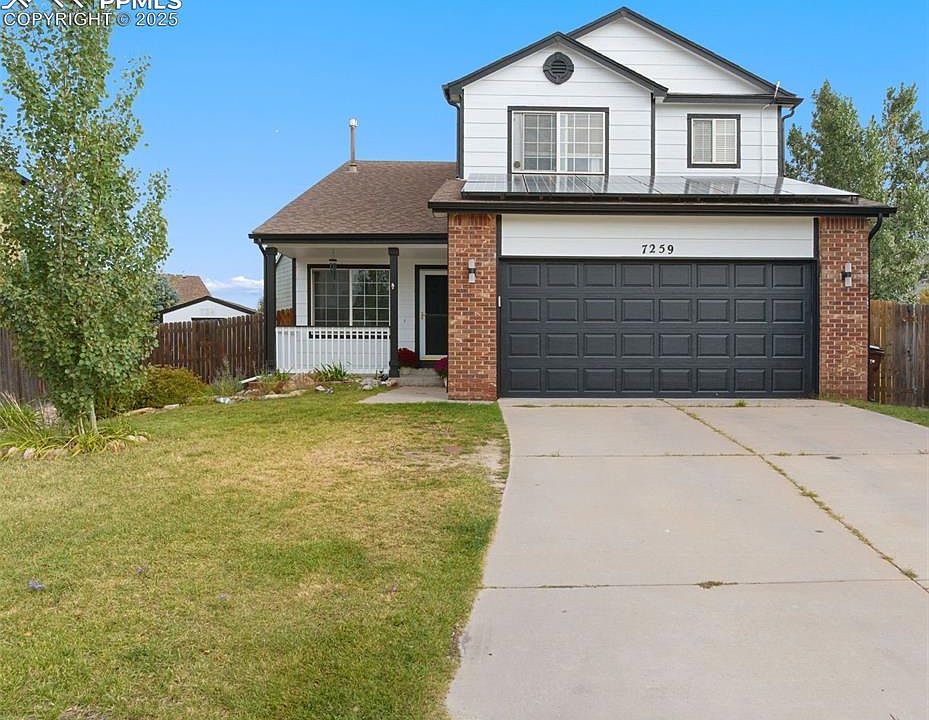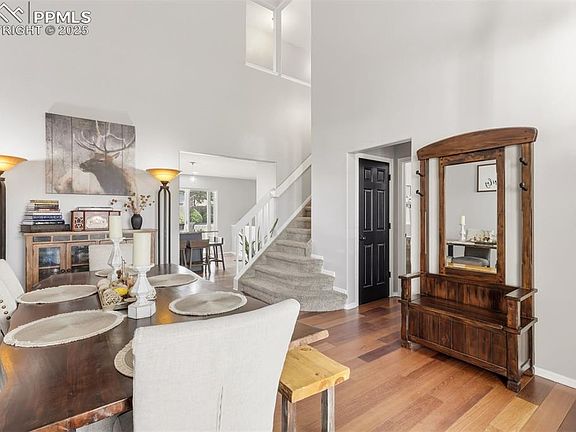 Welcome to this spacious two-story residence tucked on a large cul-de-sac lot in the Wagon Trails neighborhood which is located on the North East side of Colorado Springs with easy access to all military bases and The Penrose Saint Francis Hospital. Thoughtfully designed for comfort and versatility, the home offers six bedrooms, four bathrooms, and a two-car garage, with inviting indoor and outdoor living spaces. The main level features a formal living and dining room, a welcoming family room, and a remodeled kitchen with soft-close cabinetry, granite countertops, and stainless steel appliances with gas cooking for the chef of the house and a large island for casual meals in the kitchen. The access to the rear Trex deck and large back yard is off the kitchen through a sliding glass door. The large lot allows room for a dog run along the side of the garage with a dog door for access. The deck features a metal Pergola and a gas fire table. Durable engineered hardwood flooring extends throughout the main level, where you’ll also find a main level bedroom that makes a great home office, and a convenient half bath. The laundry/mud room is located on the main level off the garage. Upstairs, you will find four bedrooms. The primary suite features an ensuite bath and 2 closets. The additional 3 bedrooms share a well-appointed full bathroom. The finished lower level provides exceptional flexibility with new carpet and paint, a 6th bedroom, and another bonus room that could be a 7th bedroom that has a rough in for a sink, 4th bathroom, a large recreation room, and a bonus space ideal for exercise or storage. Solar panels were added in 2020 and provide energy efficiency to reduce monthly utility costs. Residents also enjoy access to neighborhood amenities, including a pool and tennis courts, with modest annual dues. Conveniently located within walking distance to Freedom Elementary School and Eugene McCleary Park, this home blends neighborhood charm with modern updates.