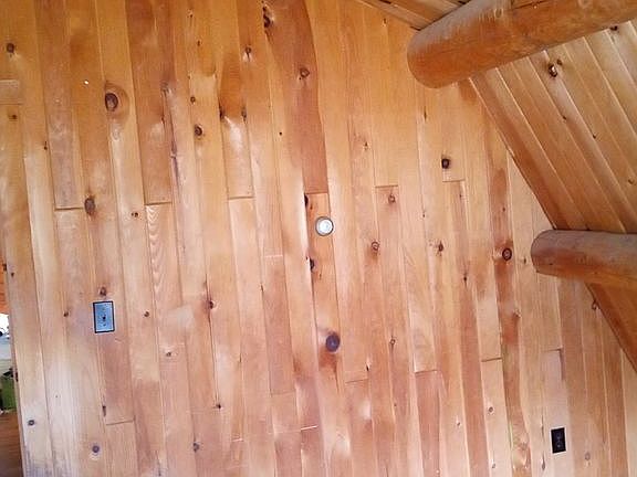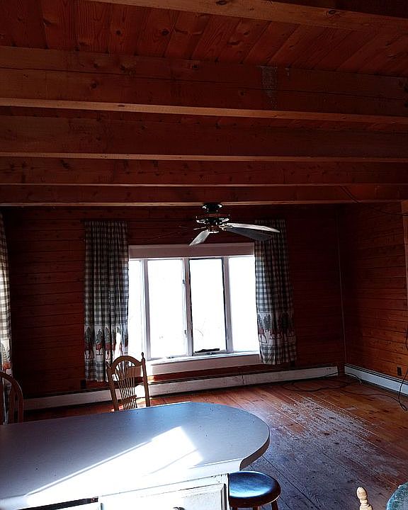 Log cabin, with an open layout, two bedrooms upstairs and a small bedroom and bathroom downstairs. A large heat storring fireplace, and an extra flew for a wood stove . A two car garage, lots of parking .There is a South facing view into New Hampshire, perfect for solar panels. It's a 10 minute drive to mousem lake boat launch. And a quick trip to town. There is a large porch on the front, perfect for BBQs. There's a washer dryer hookups on the main floor and hookups in the basement.