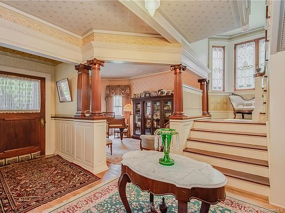 This iconic home in Hartford's historic West End is a perfect blend of period features and comfortable, modern lifestyle. With 6 bedrooms (currently 2 home offices and 4 bedrooms and a huge Mark-Twain-House-style billiard room (awesome family room, there is space for everyone's needs. You can revel in the period beauty and craftsmanship of yesterday in every room while enjoying modern conveniences for everyday family life and entertaining. Offered for only the third time in 120 years, this home is one of the area's most unique homes, offering fabulous architectural details both inside and out. Entering the home from the deep front porch, with its award-winning restoration, one encounters mahogany columns and panels denoting the music room and parlor/LR with beautiful FP mantel and hand silkscreened period wall coverings. Original lighting fixtures light your way through the pocket door, flanked by a spectacular dining room fully encircled by raised quarter-sawn English oak panels, china closets, FP, hand painted frieze and stained glass. Pass through the 2 pantries to the eat-in kitchen with tin ceiling, butcher block counters, copper backsplashes and copper hood over Viking range. The staircase turns to a 4-panel stained glass landing to 4 bedrooms (master w/FP and a full bath with original marble sink and clawfoot tub. The 3rd floor FR has 2 leaded Palladian windows, built-in seating (with storage for toys and the "turret" room, perfect for board games.