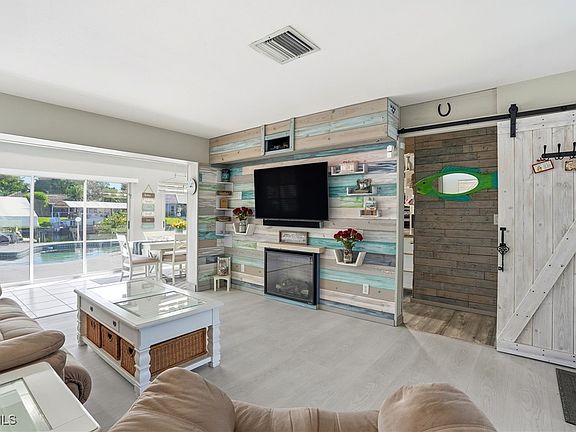 Inside, you’ll love the warm coastal cottage décor, highlighted by a shiplap accent wall, electric fireplace, and barn door in the living room—all overlooking the free-form pool and canal views.