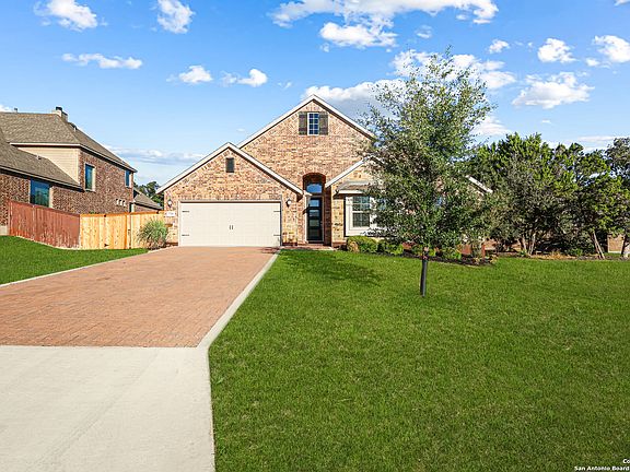 Welcome to your dream home in the desirable gated community of Valencia Park Enclave! This stunning 4-bedroom, 3-bath residence sits on a spacious half-acre homesite, offering the perfect blend of elegance, privacy, and comfort. Step inside to find rich wood flooring, a dedicated study, and an open-concept layout ideal for entertaining. The gourmet kitchen is the heart of the home-featuring designer cabinetry, a huge island with undermount sink, Silestone countertops, built-in stainless steel appliances, and a beautiful custom backsplash. The inviting family room flows seamlessly to a covered patio, perfect for relaxing evenings or weekend gatherings overlooking your private, fenced-in backyard. The luxurious primary suite includes a bay window and a spa-inspired bath with a stand-alone soaking tub, an expansive walk-in shower, and dual vanities. Energy efficiency meets modern living with solar panels, while the gated setting ensures peace of mind. Located in the desirable Valencia Park Enclave off Borgfeld & Blanco, you'll enjoy easy access to Highway 281, local amenities, top-rated schools, and scenic parks. Don't miss the chance to make this your dream home-schedule a showing today!