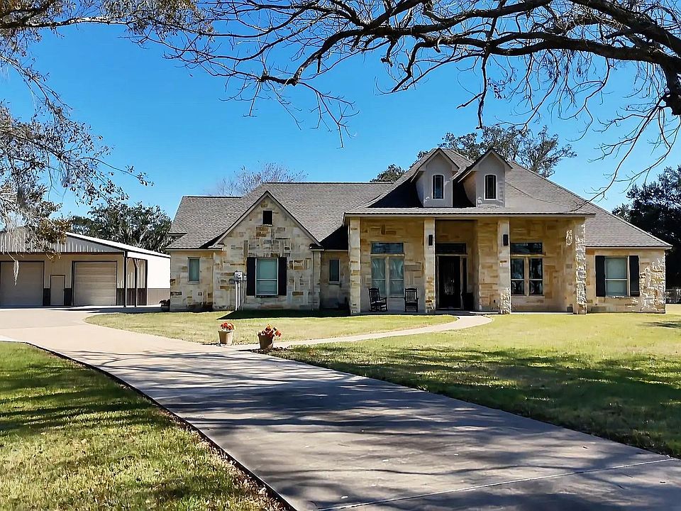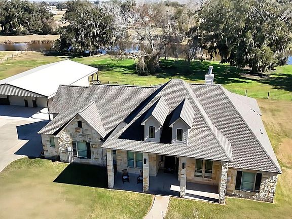 Set on approximately 2.54 wooded acres along Mill Bayou, this custom home offers privacy, views, and thoughtful design throughout. A deep covered front porch with soaring ceilings leads to an 8’ iron entry door. The first floor features wood-look porcelain tile, coffered and tray ceilings, and a true open layout connecting the kitchen, dining, and living areas. The kitchen includes granite countertops, custom cabinetry, stainless appliances, and a large center island. Walls of windows across the rear of the home capture scenic bayou and backyard views from the main living areas and primary suite. The primary bedroom is privately positioned at the back with a spacious bath, oversized shower, soaking tub, dual sinks, and a custom walk-in closet. Secondary bedrooms are located toward the front for added separation, with a large upstairs flex room ideal for a game room or bedroom. Enjoy abundant wildlife, mature trees, and peaceful outdoor living in this one-of-a-kind setting.