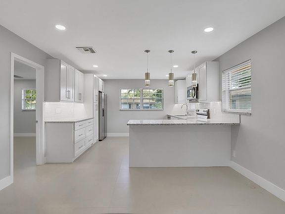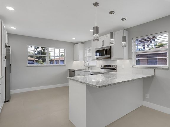 Crisp, captivating elegance. Entirely renovated open floor plan villa on a col de sac lot. Bright and airy interior boasts 24x24'' porcelain floors, 5 1/2'' baseboards, and recessed and dimmable lighting throughout.10 feet by 13 feet Flowing kitchen invites Grand Scale entertaining featuring 12'' of carryover granite space for bar stools, 31 soft-close cabinets for kitchen essentials, glass backsplash, huge 30'' Lazy Susan, recessed and under cabinet lighting, double door fridge, and matching stainless steel appliances. Both bathrooms showcase matching 24x24'' porcelain on the walls and quartz on countertops, anti-fog mirrors with LED lighting, sliding glass shower doors, temperature setting 5 shower jets with LED light, and a handheld shower unit.... An abundance of windows bathe the home in natural light. A sunny and large Florida room could be utilized as a den/office space and as a living/sitting/dining area.