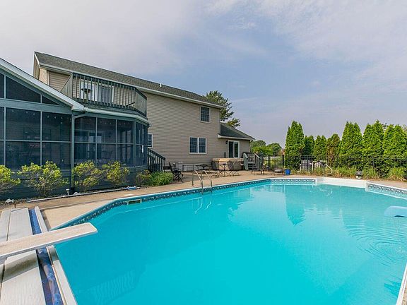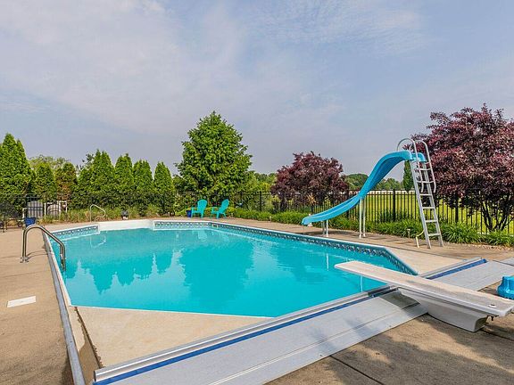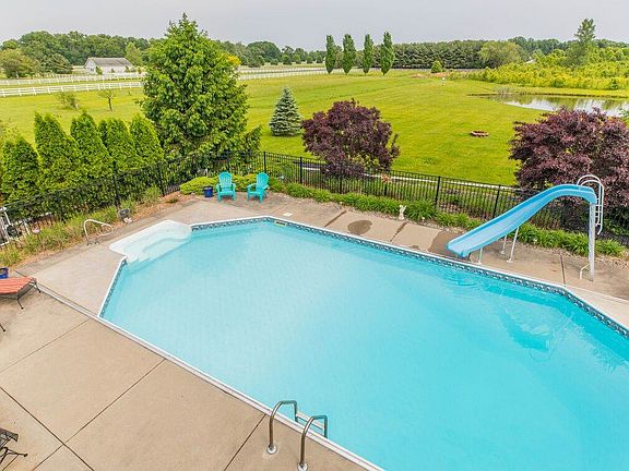 Inviting home on 5 acres has so much to offer. Main floor consists of wood flooring, updated kitchen w/confection oven, eat-in space, cathedral ceiling family rm w/fireplace & walk-out to the covered deck, formal dining & living rooms, AND owner suite w/jetted tub, tiled shower, walk-in closet & access to deck! Upstairs are two full bath, loft & 2 bedrooms. One bedroom has door leading to balcony. Large basement has cellar door leading to backyard. One room is partially finished. Now, the outside! Enclosed deck, in-ground pool, hot tub, stocked pond & trees. Detached garage designed for RV storage & more. Some upgrades include newer roof, sump & furnace in 2018, newer carpet & paint, appliances, water softener & reverse osmosis system. A pleasure to show!