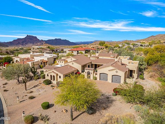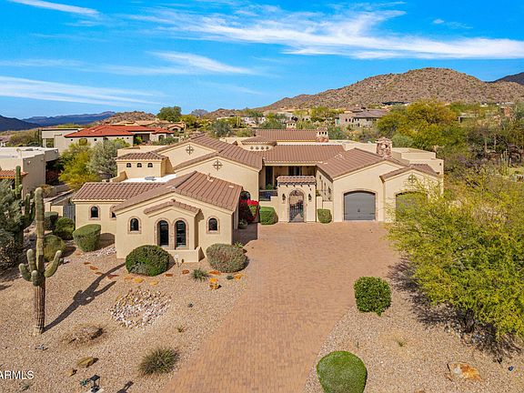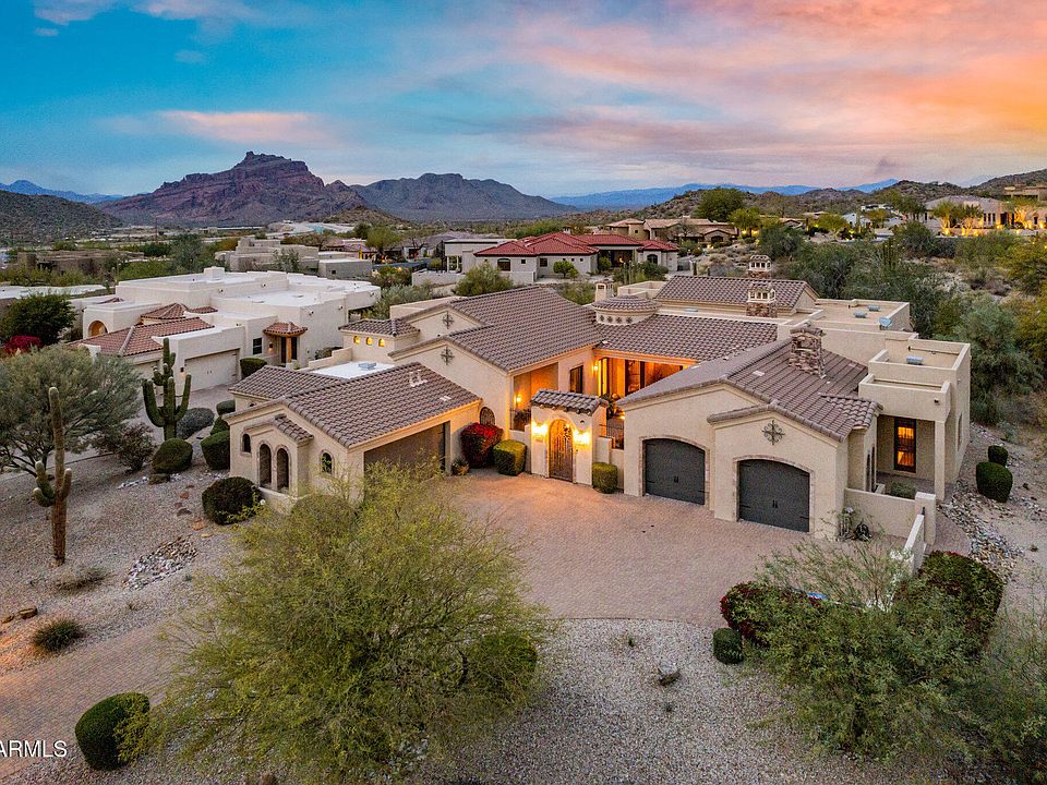 Welcome to this enchanting, custom-built residence, located in the award-winning master-planned community of Las Sendas. Thoughtfully curated to highlight breathtaking views of Red Mountain and the pristine Sonoran Desert, this European-inspired home was constructed with upgraded concrete block for lasting quality and energy efficiency. Nestled amid the lush desert landscape and bordering a natural preserve, this 5,526-square-foot estate is designed for seamless indoor-outdoor living. A vast telescoping glass wall connects the home's main living space to an oversized covered patio, creating an inviting setting for dining al fresco or entertaining. The heated pool and spa, finished with blue glass mosaic tiles, feature cascading water elements and swim-up table. Other elements include a cozy seating area with a fireplace, synthetic turf, and an illuminated staircase leading to an elevated view deck with panoramic vistas.