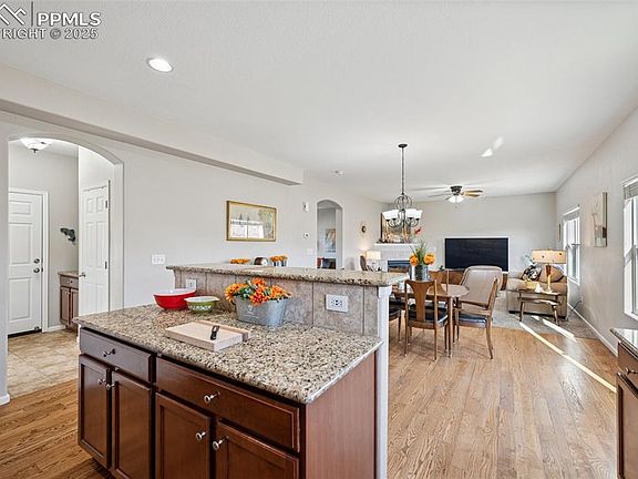 Tucked away in peaceful Forest Meadows neighborhood near Black Forest, this home combines quiet living with convenient access to the Powers Corridor and nearby hospitals. If you are looking for a home with VIEWS! This is it! The spacious covered front porch offers a front-row seat to sweeping views of Pikes Peak, blending comfort and Colorado grandeur. Brand new landscaping includes: 3 Evergreens, 2 Peach, and 1 Maple tree, extended back patio, and even your own mini-Stonehenge! This home has been meticulously maintained and shows pride in homeownership. Inside you will find 3/4” hardwood flooring, newer carpet – 2020, and brand-new paint. The front room, spacious loft and master bedroom highlight uninterrupted views of majestic Pikes Peak—Colorado living at its finest. The open-concept layout seamlessly connects a cozy family room with a gas fireplace, a dining area beside the back slider, and a well-appointed kitchen. The kitchen impresses with granite countertops, convenient pull-out shelves, a stylish tile backsplash, a spacious walk-in pantry, an upgraded refrigerator, and a sink with a view of the backyard. The main level also includes a half bath with pedestal sink. Retreat to the spacious Primary Suite boasting those VIEWS, a spa-like 5-piece bath with dual vanities, comfort-height counters, elegant tile flooring, a tile-accented shower, stacked stone backsplash, a relaxing soaking tub, and an expansive walk-in closet. This level also offers THREE generously sized bedrooms with walk-in closets, a conveniently located laundry room, a spacious loft with scenic views, and a full bath featuring a dual vanity. And, that’s not all! Air Conditioning! Garage includes TV, overhead storage, and cabinets. The 1,000 sqft unfinished basement is ready for your vision—pre-plumbed, insulated, vented, and equipped with electrical, offering a head start on future expansion!