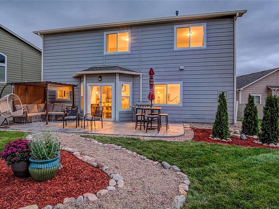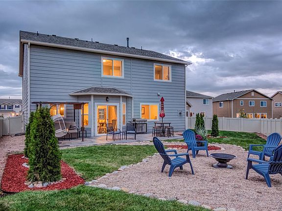 Beautiful home on cul de sac with Mountain View's and a Pikes Peak view. Upgraded Bay window slider opens to a stamped concrete patio and large backyard perfect for entertaining. There is an extra gas line on the patio for your grill as well as covered pergola and sofa to enjoy the beautiful Colorado evenings outdoors. The upgraded gourmet kitchen boasts a gas cooktop, double ovens, island with storage, soft touch cabinet doors, large walk in pantry and plenty of cabinet storage. Granite countertops throughout the home.Stone gas fireplace with a hearth in the living room and laminate wood flooring throughout the main level living. The upgraded wood and metal banister leading up to the loft creates an open elegant feel. There is upgraded plush carpet and thick padding throughout the upstairs loft, bedrooms and office. The very large master bedroom has hardwired bedside lighting as well as a mounted smart tv. The 5 pc.