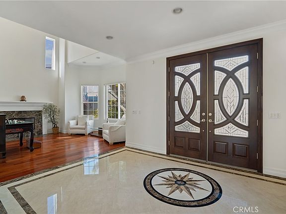 As you enter the double front entryway doors into the foyer you can't miss the custom mosaic tile medallion welcoming you inside and the grand vaulted ceiling leading to the living room and fireplace number one. The formal dining room has gorgeous hardwood floors and a full wall of built-in custom cherrywood cabinets.