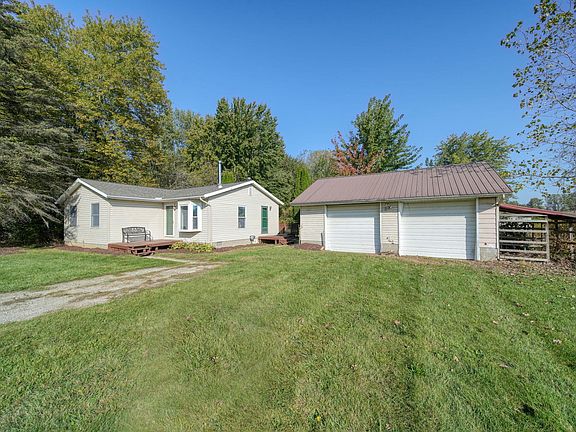 Discover peaceful living in this cozy 2-bedroom, 1-bath home nestled on a private 1-acre lot. Enjoy the convenience of a large, detached garage with overhead doors and wood heat, perfect for hobbies or storage. The home features updated bathroom, flooring, and fresh paint,