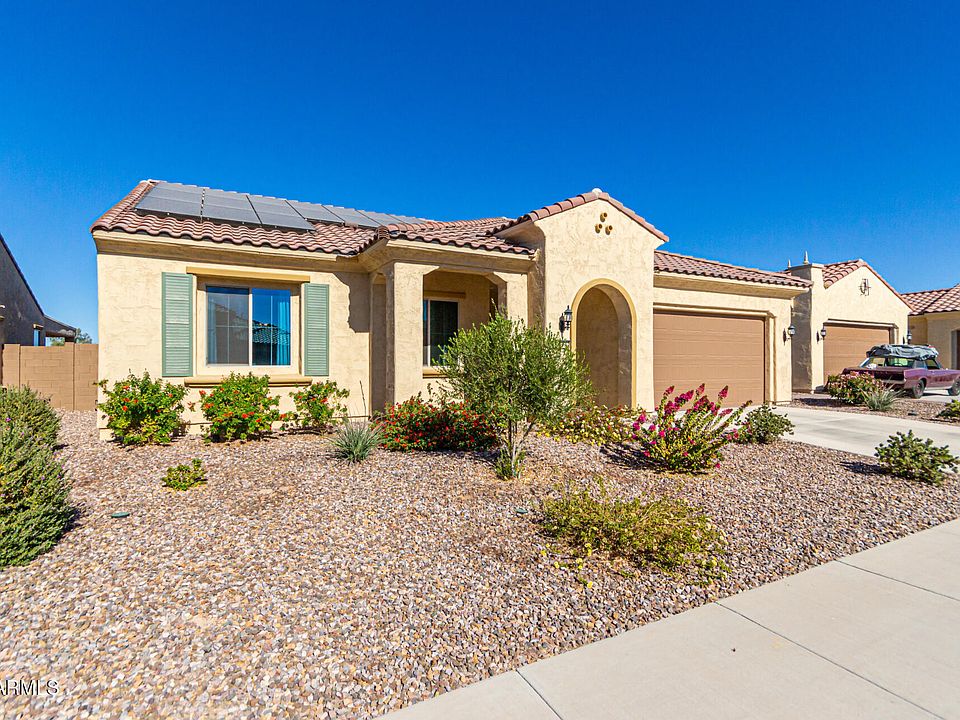 BEST VALUE, PRICE/SqFt, ON THE MARKET!! This 2022, LIKE NEW PURSUIT offers comfort, style & SPACE in the vibrant Sun City 55+ community! Great opportunity to own OVER 2,000 SF w/ 10' Ceilings & 8' Doors, private fully enclosed/landscaped yard (w/PVC)! The CHEF'S KITCHEN, overlooking the Great Room & spacious Dining Room, features granite counters, GAS cooktop, built-in oven/microwave, stainless appliances & center island! Primary suite features a step-in shower w/ bench, dual sinks & generous walk-in closet; The 10'x14' DEN & Bedroom/guest bath are private off the entry. Additional highlights include Eco-2 stage water filter/softener & 2-1/2 tandem garage. BASE price on new--$400,000! Buy this AMAZING home, fully landscaped w/ gas range, water system & solar- ONLY $395,000! Don't wait!!