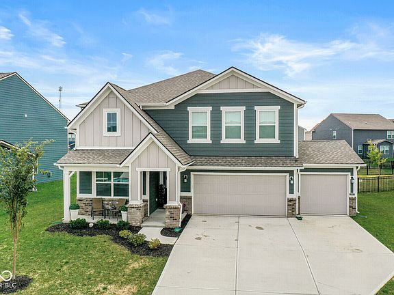 Experience refined living in this nearly new Lennar-built residence, perfectly situated in the highly desirable Cardinal Pointe community of Whitestown. Offering 5 bedrooms, 3 full baths, and over 2,850 square feet, this home combines modern sophistication with everyday comfort. The open-concept main level is designed to impress, showcasing a chef's kitchen with quartz countertops, stainless steel appliances, a gas range, and a sunlit morning room. The great room is anchored by a cozy gas fireplace with custom built-in shelving, an ideal setting for both relaxed evenings and elegant entertaining. Completing the main level are a private glass-enclosed study, a guest bedroom, and a stylish drop zone with cubbies for effortless organization. Ascending to the upper level, retreat to the luxurious primary suite with its spa-inspired tile shower, accompanied by three additional bedrooms, a versatile loft, and a convenient laundry room. A 3-car garage and manicured landscaping enhance the home's curb appeal and functionality. Life at Cardinal Pointe is enriched by resort-style amenities, including a sparkling pool, pickleball courts, playground, and a social membership at the Golf Club of Indiana. Spectrum high-speed internet is also included through the HOA, ensuring both connectivity and convenience. With shopping and dining at Anson just minutes away and downtown Indianapolis less than a half-hour drive, this home offers the perfect balance of luxury, lifestyle, and location